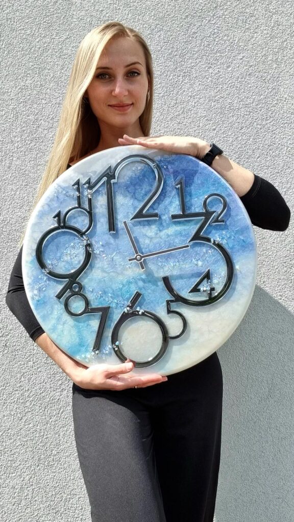 • Zegar z żywicą w tych kolorach zachwyca niepowtarzalnym wzorem przypominającym bezkres nieba, wprowadzając lekkość i spokój do wnętrza.