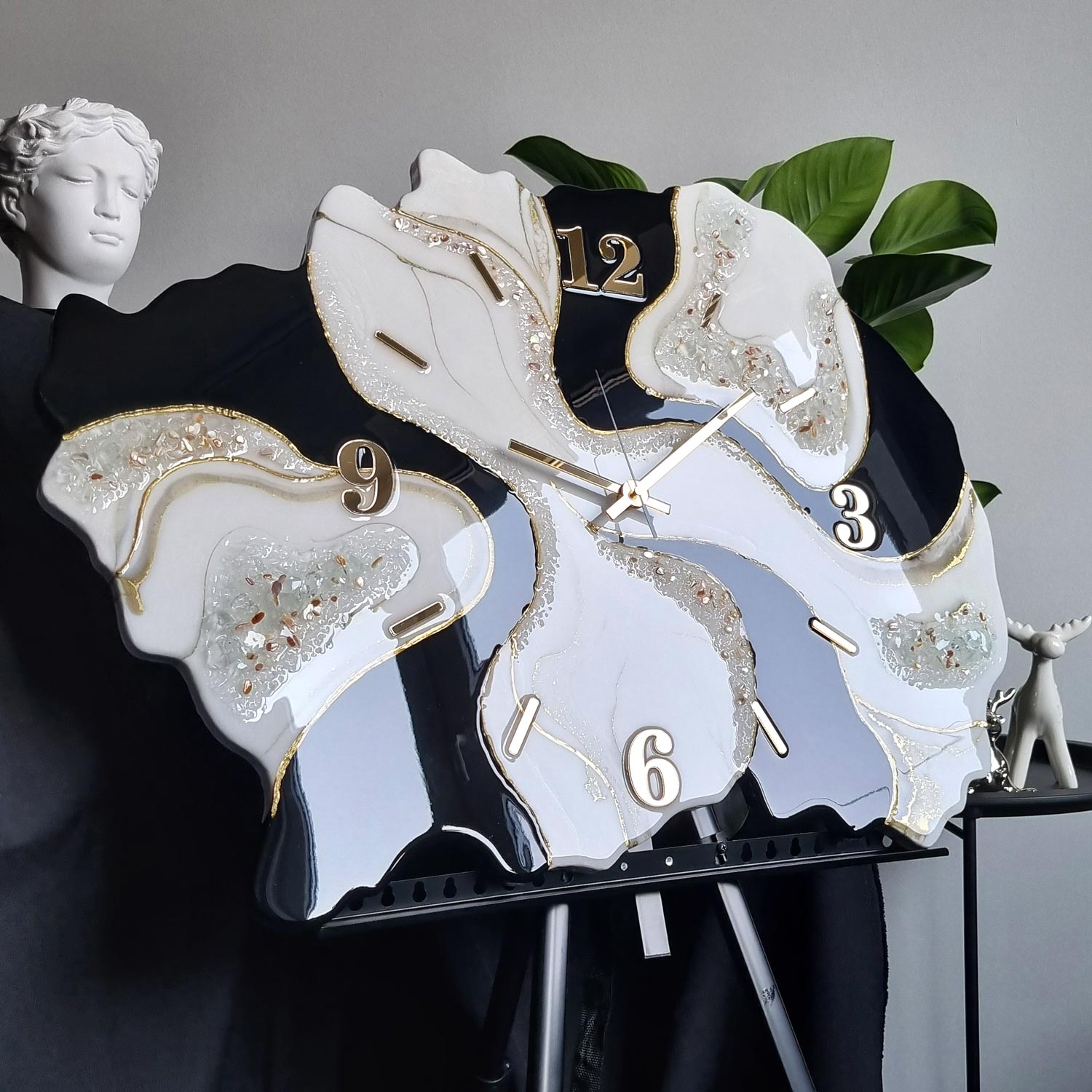 Są rzeczy, które nie tylko odmierzają czas — przypominają, jak jest on cenny. ✨ Zegar ścienny z żywicy „Harmonia Gold” zachwyca swoją formą inspirowaną naturą. Baza w kształcie geody (55 × 71 cm) tworzy wyjątkową, artystyczną kompozycję. Subtelne odcienie bieli, czerni i złota przenikają się w eleganckim wzorze z żywicy epoksydowej, tworząc efekt pełen spokoju i harmonii.