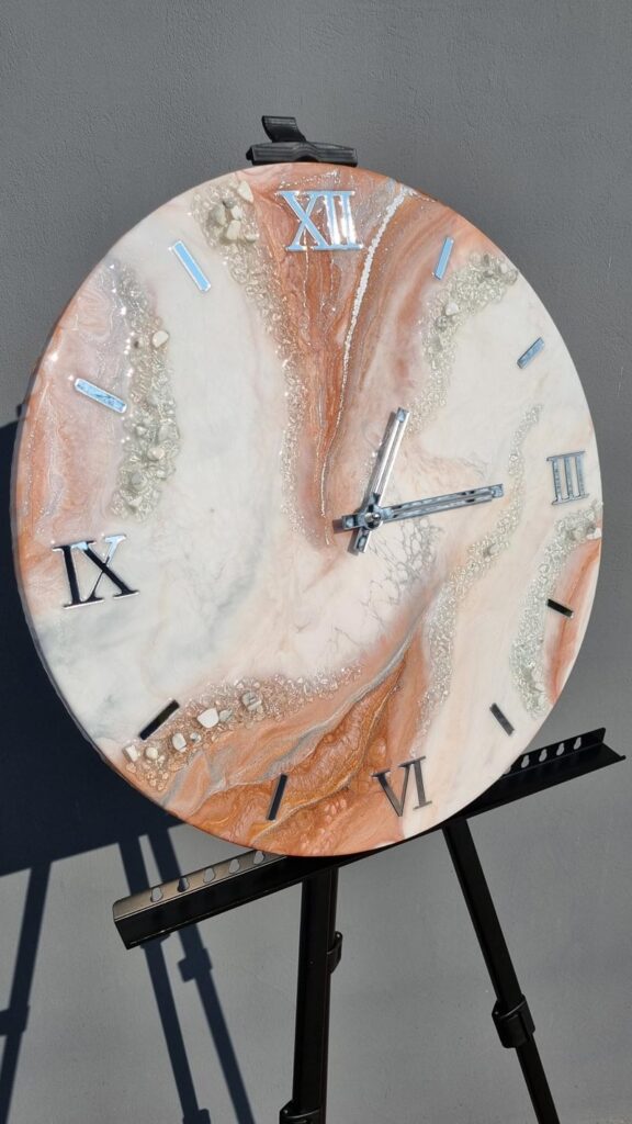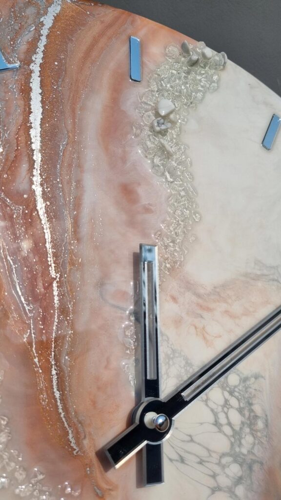 50 cm. Zegar ścienny „Jasno brązowy marmur” – wzór wykonany z żywicy epoksydowej. Dodatki kamienie: kryształy górskie oraz magnezyt. Cichy mechanizm zegara.