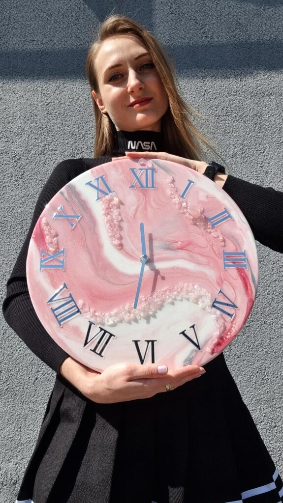 Uroczy i elegancki — ten zegar to jak geoda, która przeszła przez różową chmurkę miłości. Wykonany z żywicy epoksydowej, zachwyca subtelnym marmurkowym wzorem w odcieniach jasnego różu i bieli.
