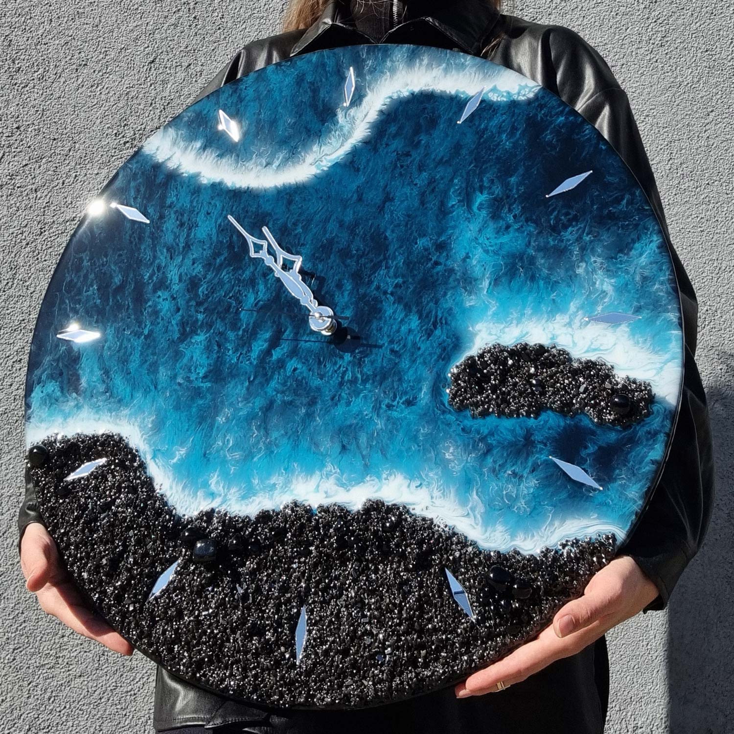 60 cm. Zegar ścienny „Turkusowe morze” – wzór wykonany z żywicy z efektem fal, głęboki turkus z białymi falami, uderzającymi o czarny wulkaniczny brzeg. Ciczy mechanizm zegara.
